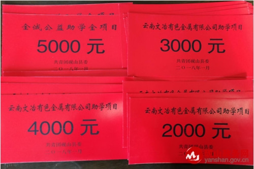 连日来,共青团砚山县工作人员深入阿舍上沙、平远秃水寨、 者腊一碗水 等村寨,将 云南文冶有色金属有限公司、 金城公益出资的 6万元助学金发放到16名贫困学生手中。
